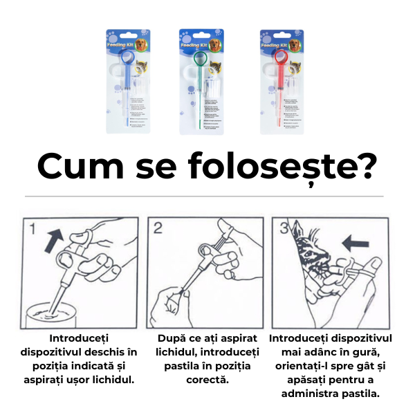 Dispozitivul este conceput pentru a ajuta la administrarea pastilelor direct în zona corectă, facilitând înghițirea rapidă. Animalul nu mai scuipă medicamentul, iar procesul devine mult mai ușor și mai calm.